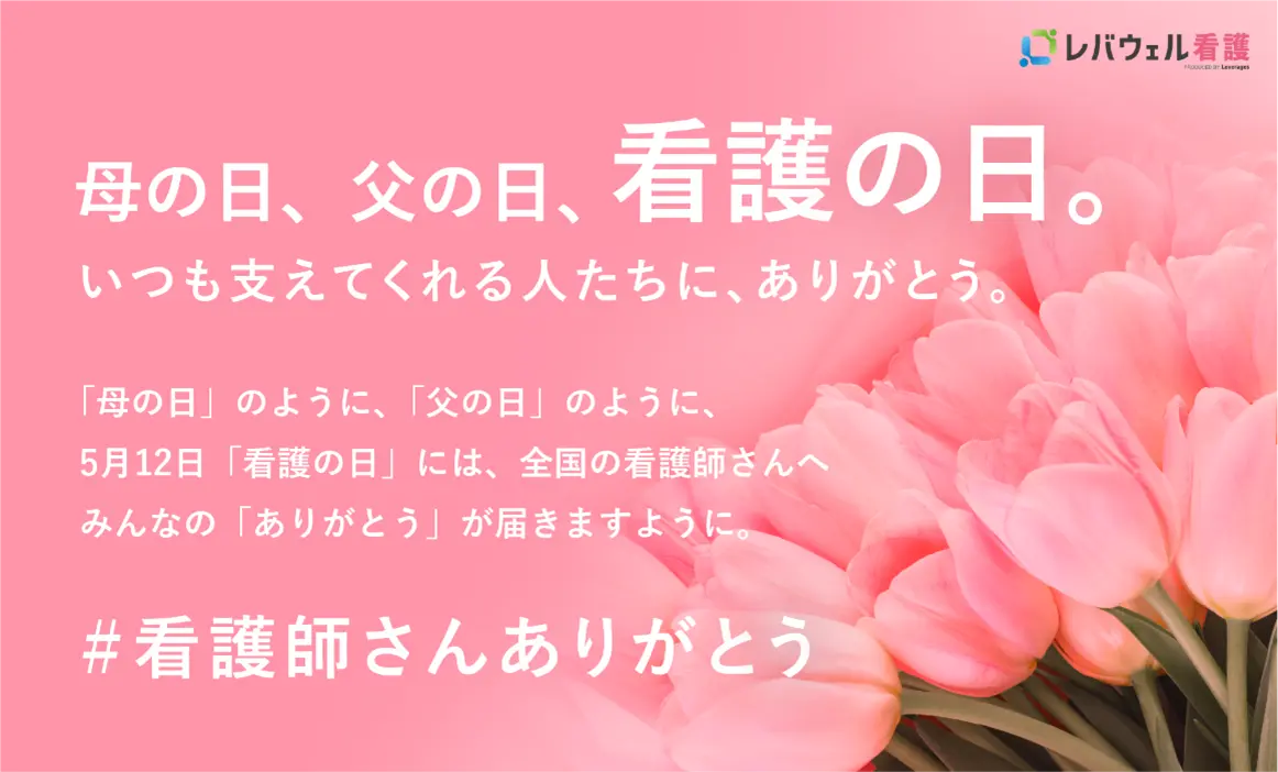 レバウェル看護では、看護師に対して感謝の想いを届ける『看護師さんありがとうプロジェクト』を2023年5月12日に開催し、チューリップやメッセージカードを配布したり、看護師に向けたメッセージが書き込まれた巨大ボードを掲示したりしました。